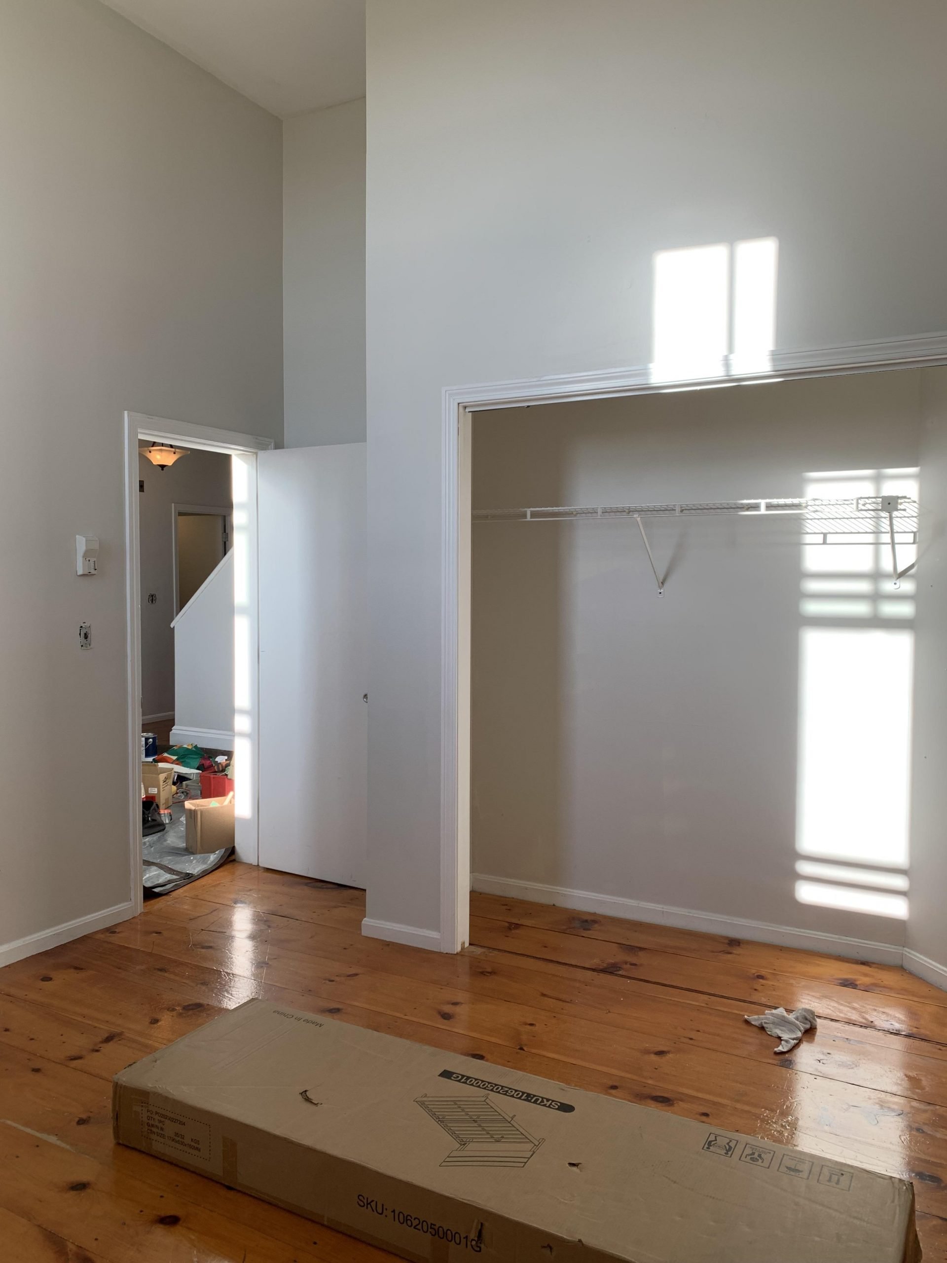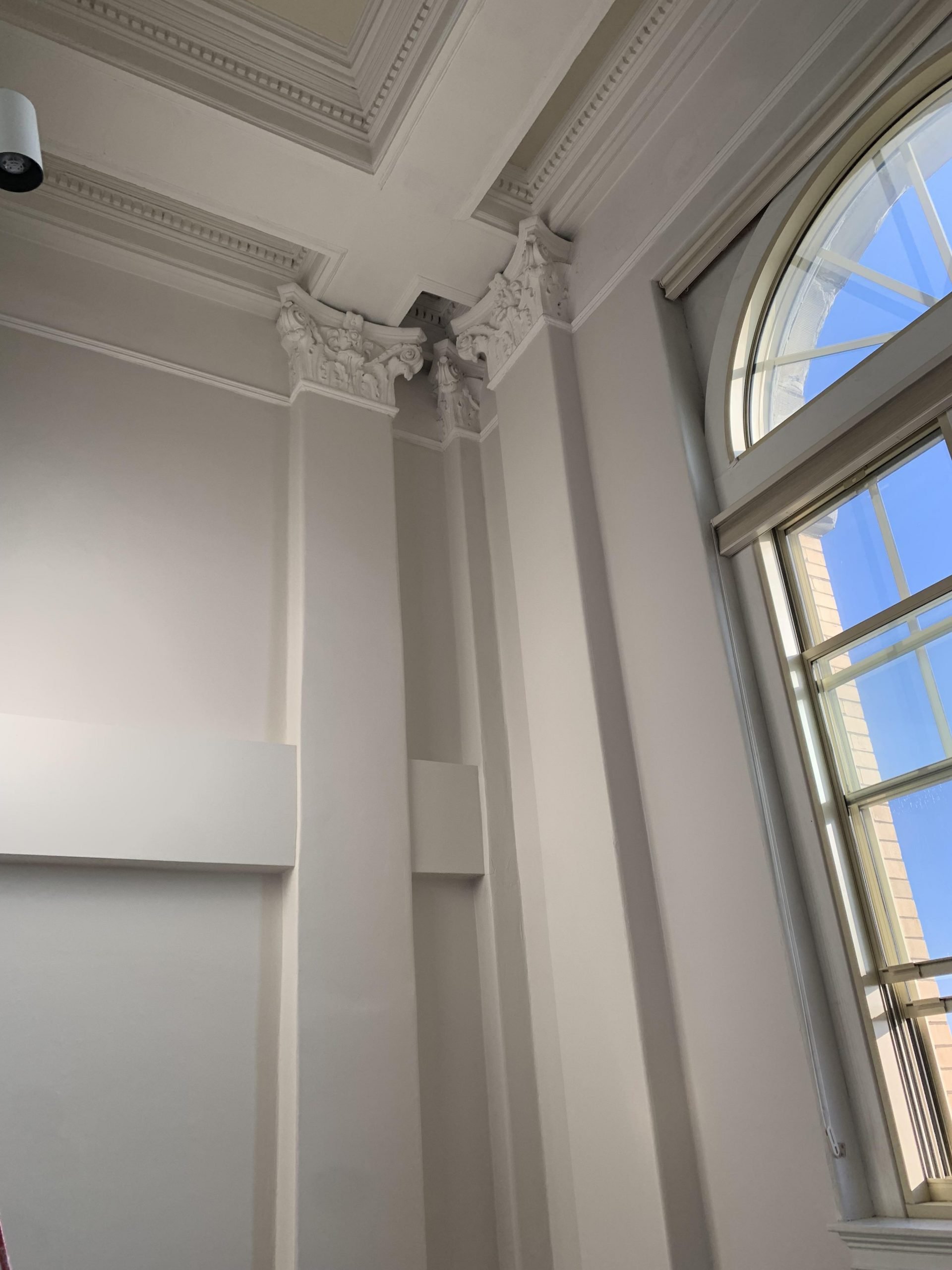 The living area has incredible 28-foot ceilings, showcasing the original column detail and coffered ceiling. His unit was designed within a section of the former auditorium, including a bi-level loft that creates a double-height living area. Natural light pours in through the Palladian window creating a space filled with soul-soothing, light. The wide plank pine floors with original square nails bring more character and warmth to the living area. We are in the throes of a painting refresh. The transformation is worth the work.