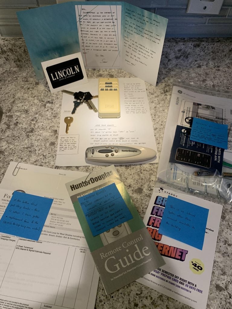 Here’s an A-Game handoff: hand-written notes, neatly organized manuals, keys, controllers, and neighborhood recommendations. The gift card to Lincoln was incredibly generous of the Seller, and greatly appreciated.